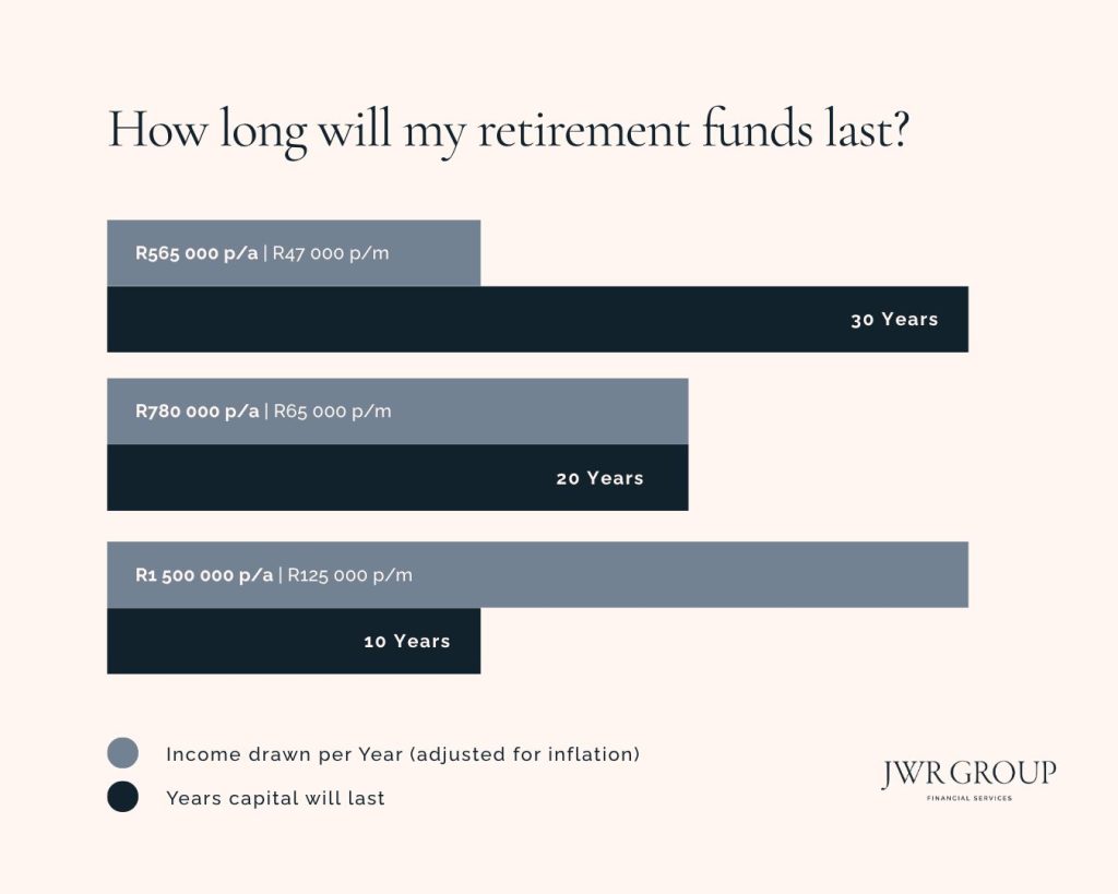 If you have retirement capital of R15 000 000 and get a return of 5% on it after tax and costs, with an inflation rate of 4%, your capital will last: